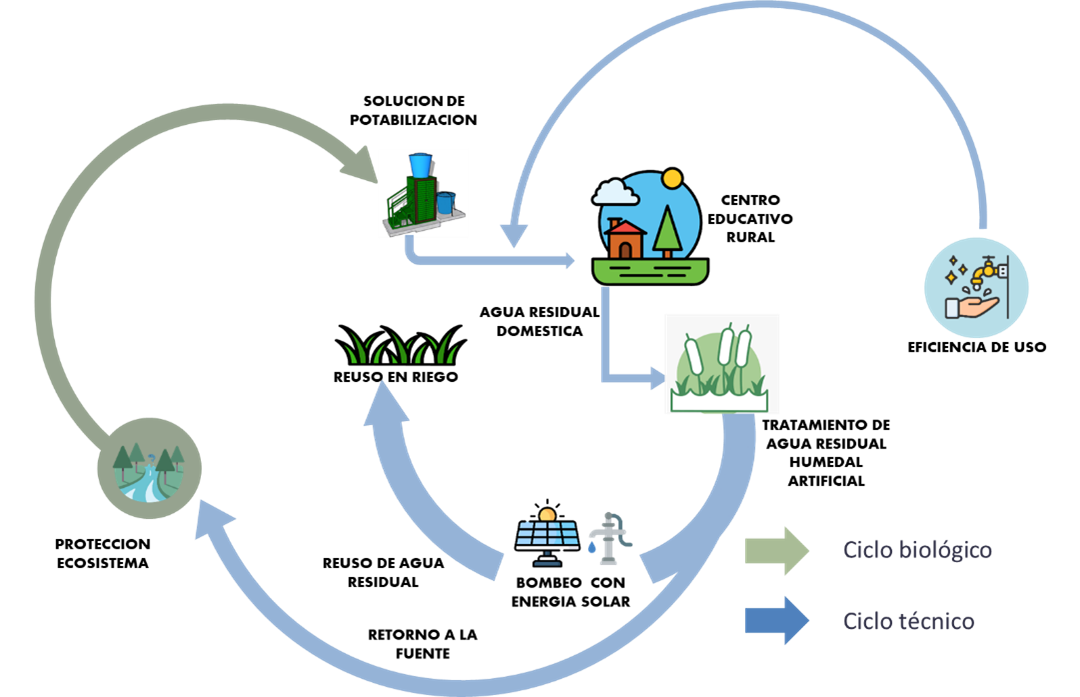 2.6. Gestión y Calidad: | “Agua para la educación, educación para el agua” entrega soluciones de potabilización tecnológicas mediante una infraestructura elaborada en madera plástica reciclada que disminuye los impactos generados en el medio ambiente por la extracción de nuevos recursos. Nuestros sistemas de potabilización son de alta calidad pues cuentan con filtros con las mejores tecnologías del mercado, lo que garantiza un tratamiento adecuado del agua para el consumo humano. La ilustración a continuación explica las soluciones, ciclos y actividades que se desarrollan en las intervenciones del proyecto: