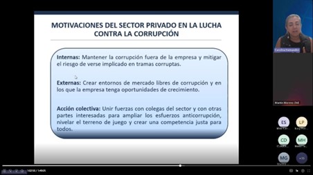 En un segundo instante intervino Diana Carolina Hernandez Viveros, Coordinadora de Derechos Humanos y de Lucha contra la Corrupción en Pacto Global Red Colombia. Abordó los fundamentos del Principio 10 de Pacto Global: Lucha contra la corrupción, la prevención de la corrupción desde el sector privado, y cómo una empresa puede implementar el Principio 10.