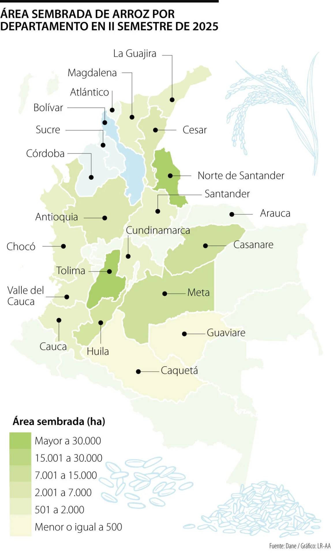 La jefa de la cartera explicó que, aunque la emergencia climática ha dejado afectaciones graves en ocho departamentos, particularmente en Bolívar, Sucre y Córdoba, “hay 1.400 hectáreas de arroz en riesgo correspondientes a la cosecha del primer semestre. De estas, 700 se concentran entre Bolívar y Sucre, en La Mojana y la cuenca de San Jorge, y el resto están ubicadas en la cuenca del Sinú”.