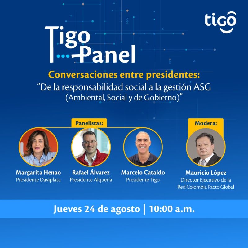 En un evento empresarial de gran relevancia, Tigo Colombia reunió a un distinguido grupo de líderes en el panel "Conversaciones entre presidentes", evento moderado por Mauricio López, Director Ejecutivo de la Red Colombia del Pacto Global, el cual fue una plataforma para el diálogo abierto entre líderes destacados del ámbito empresarial, en el que se discutieron temas referentes a la Gestión Ambiental, Social y de Gobierno -ASG